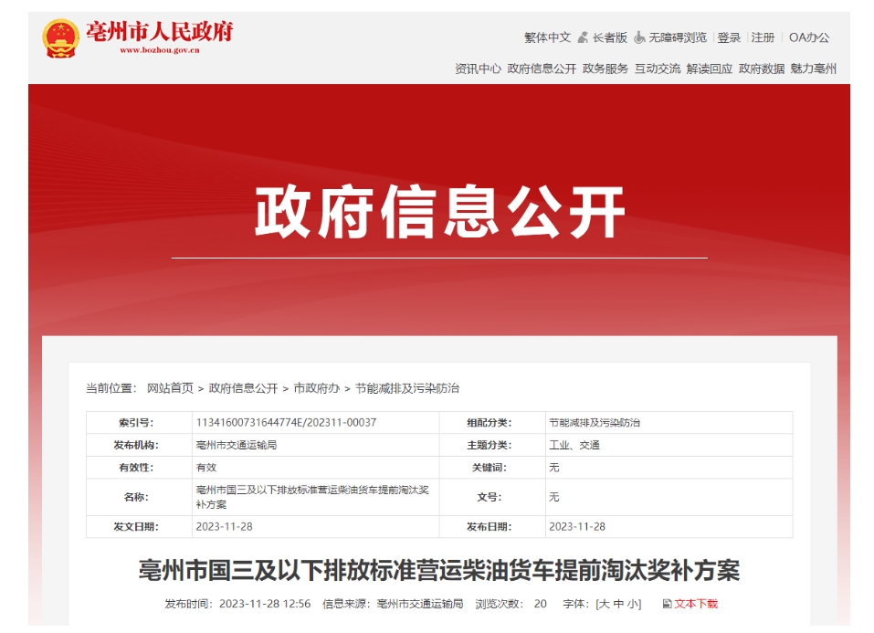 安徽省亳州市國三及以下排放標(biāo)準(zhǔn)營運柴油貨車提前淘汰獎補方案