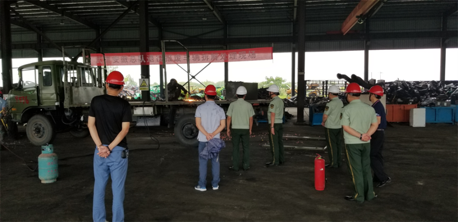 隨后在拆解車間,扶德才處長一行就此次的武警安徽總隊退役報廢車輛現(xiàn)場拆解進行監(jiān)督,過程中不斷與皖中公司相關(guān)陪同人員進行交流,對皖中公司拆解現(xiàn)場的安全防范工作給予高度評價。