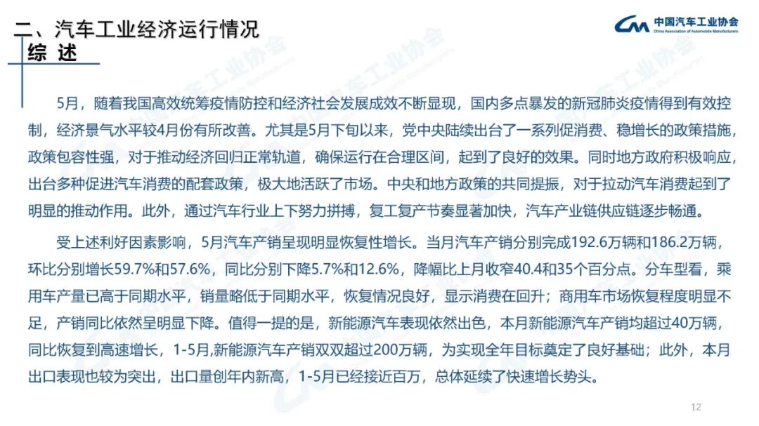 受利好因素影響,5月汽車產銷呈現明顯恢復性增長。乘用車產量已高于同期水平,銷量略低于同期水平,恢復情況良好;商用車市場恢復程度明顯不足,產銷同比依然呈明顯下降。新能源汽車表現依然出色。本月出口表現也較為突出,出口量創(chuàng)年內新高。
