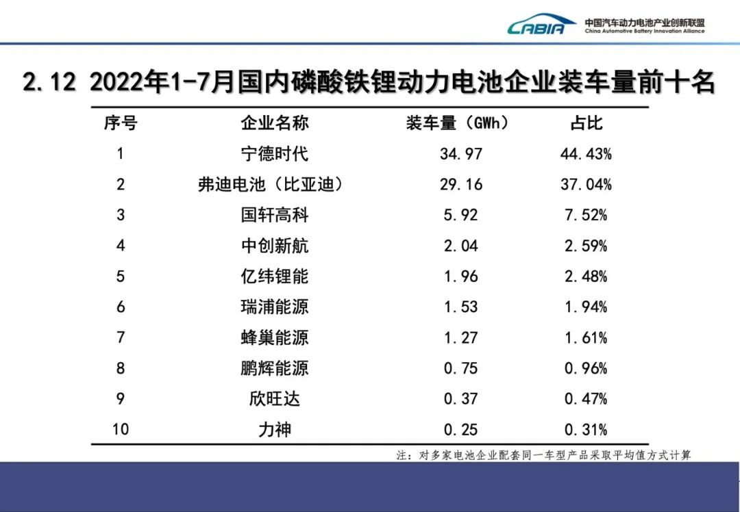 產(chǎn)量方面:7月,我國(guó)動(dòng)力電池產(chǎn)量共計(jì)47.2GWh,同比增長(zhǎng)172.2%,環(huán)比增長(zhǎng)14.4%。其中三元電池產(chǎn)量16.6GWh,占總產(chǎn)量35.1%,同比增長(zhǎng)107.7%,環(huán)比下降9.4%;磷酸鐵鋰電池產(chǎn)量30.6GWh,占總產(chǎn)量64.8%,同比增長(zhǎng)228%,環(huán)比增長(zhǎng)33.5%。1-7月,我國(guó)動(dòng)力電池累計(jì)產(chǎn)量253.7GWh,累計(jì)同比增長(zhǎng)175.6%。其中三元電池累計(jì)產(chǎn)量99.5GWh,占總產(chǎn)量39.2%,累計(jì)同比增長(zhǎng)121.9%;磷酸鐵鋰電池累計(jì)產(chǎn)量153.8GWh,占總產(chǎn)量60.6%,累計(jì)同比增長(zhǎng)227.1%。裝車(chē)量方面:7月,我國(guó)動(dòng)力電池裝車(chē)量24.2GWh,同比增長(zhǎng)114.2%,環(huán)比下降10.5%。其中三元電池裝車(chē)量9.8GWh,占總裝車(chē)量40.7%,同比增長(zhǎng)80.4%,環(huán)比下降15.0%;磷酸鐵鋰電池裝車(chē)量14.3GWh,占總裝車(chē)量59.3%,同比增長(zhǎng)147.2%,環(huán)比下降7.0%。1-7月,我國(guó)動(dòng)力電池累計(jì)裝車(chē)量134.3GWh, 累計(jì)同比增長(zhǎng)110.6%。其中三元電池累計(jì)裝車(chē)量55.4GWh,占總裝車(chē)量41.3%,累計(jì)同比增長(zhǎng)55.7%;磷酸鐵鋰電池累計(jì)裝車(chē)量78.7GWh,占總裝車(chē)量58.6%,累計(jì)同比增長(zhǎng)180.9%,呈現(xiàn)快速增長(zhǎng)發(fā)展勢(shì)頭 7月,我國(guó)新能源汽車(chē)市場(chǎng)共計(jì)37家動(dòng)力電池企業(yè)實(shí)現(xiàn)裝車(chē)配套,較去年同期減少8家。排名前3家、前5家、前10家動(dòng)力電池企業(yè)動(dòng)力電池裝車(chē)量分別為19.0GWh、20.9GWh和23.2GWh,占總裝車(chē)量比分別為78.5%、86.3%和95.9%。1-7月,我國(guó)新能源汽車(chē)市場(chǎng)共計(jì)45家動(dòng)力電池企業(yè)實(shí)現(xiàn)裝車(chē)配套,較去年同期減少8家,排名前3家、前5家、前10家動(dòng)力電池企業(yè)動(dòng)力電池裝車(chē)量分別為103.6GWh、113.5GWh和127.3GWh,占總裝車(chē)量比分別為77.1%、84.5%和94.8%。